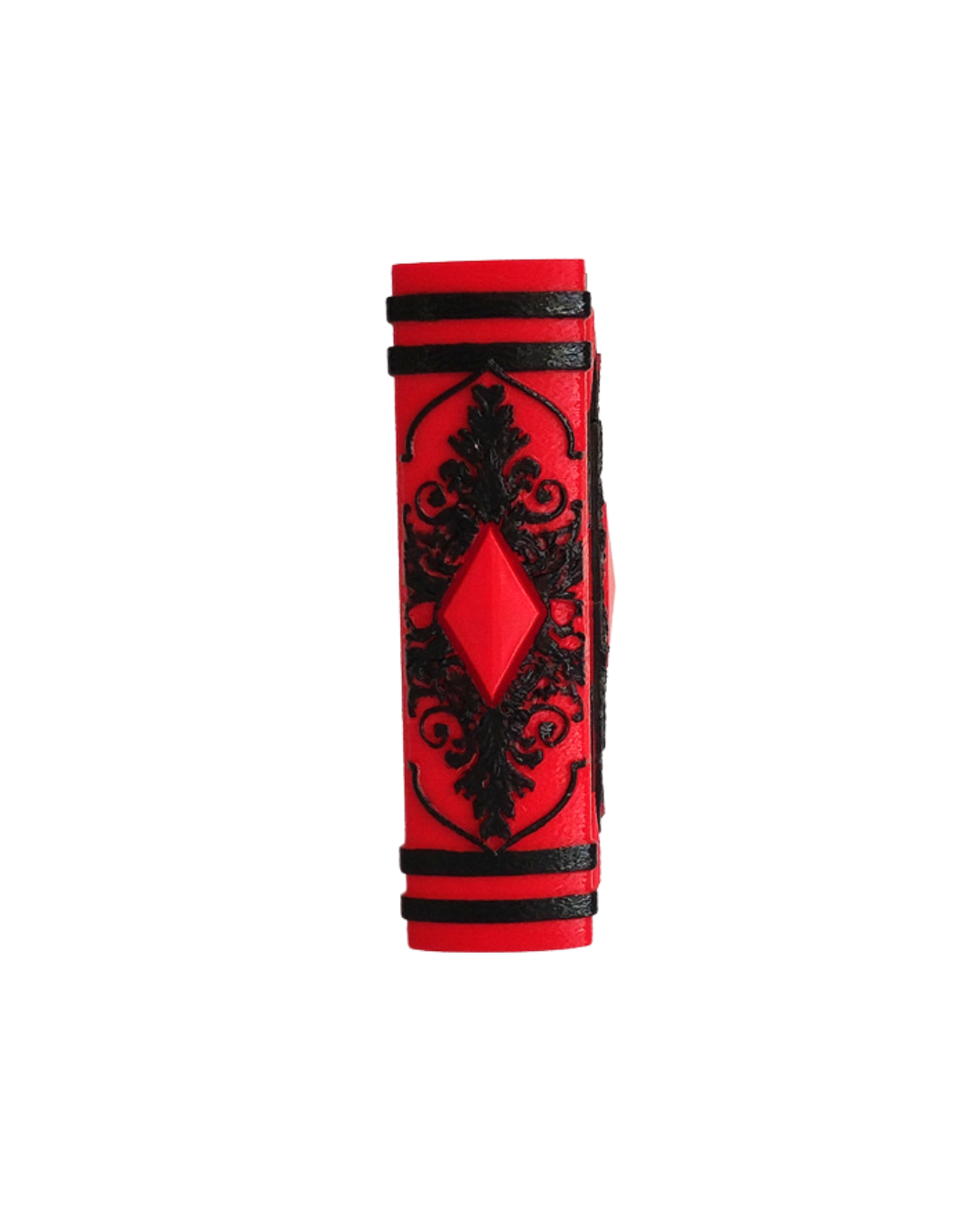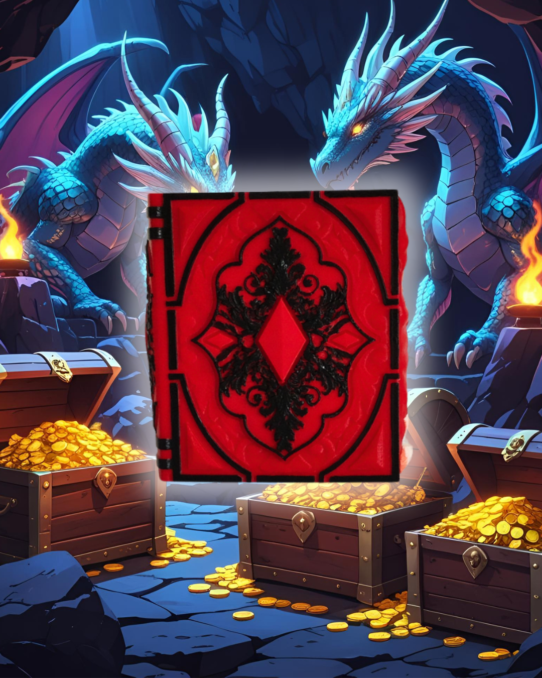 Caja transportadora con apariencia de tomo de libro con temática de cofre mimic.