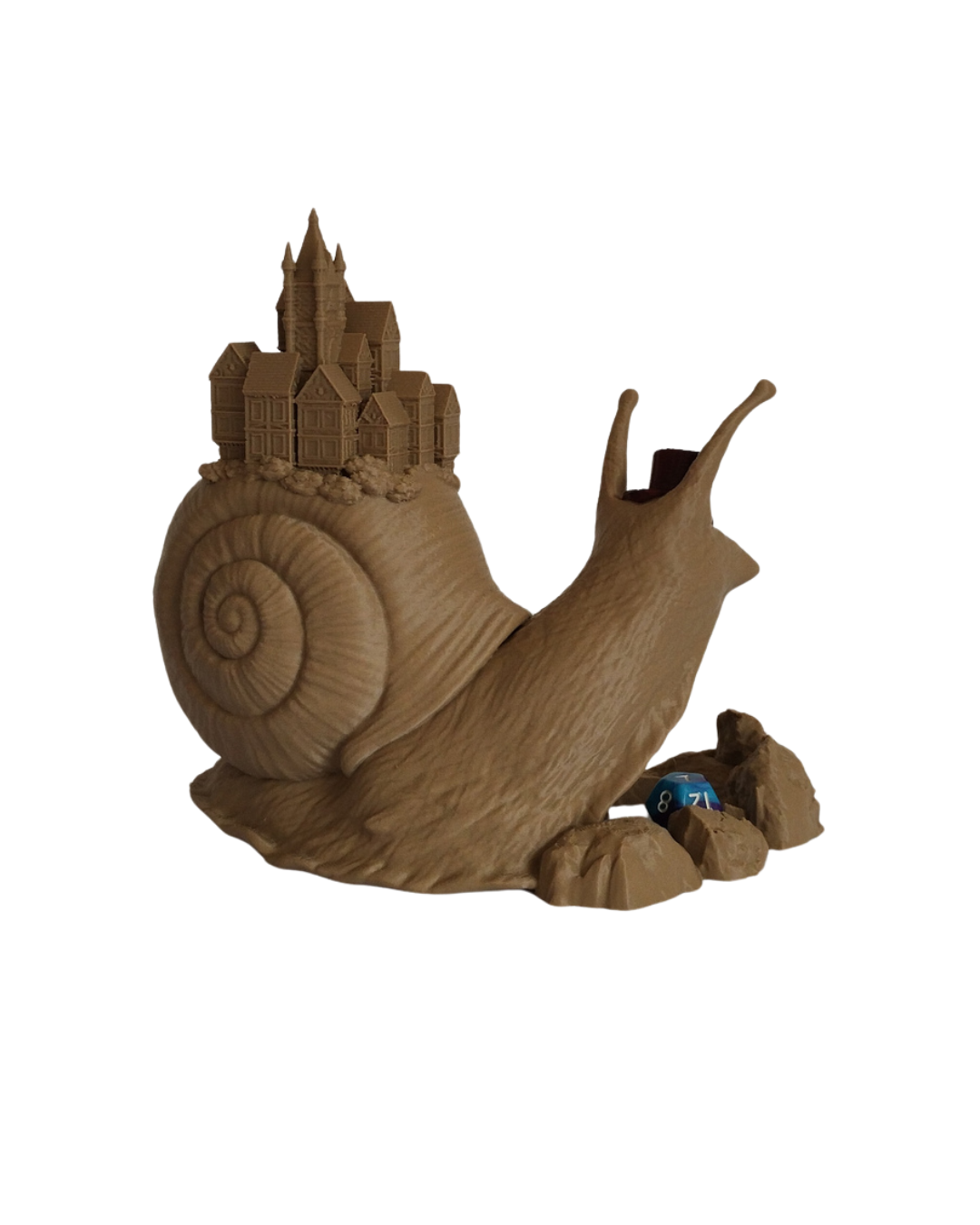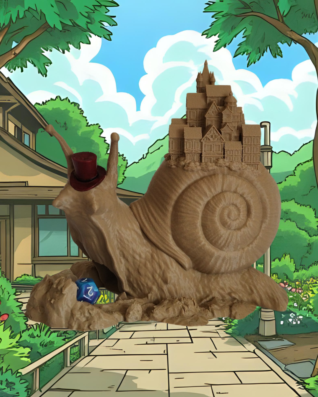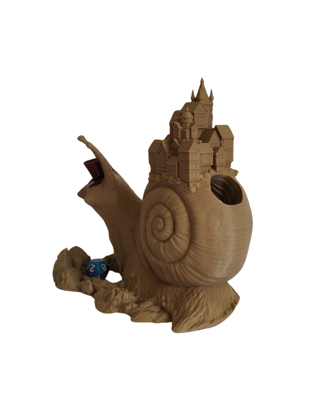 Torre de dados con diseño de una ciudad construida sobre un caracol.