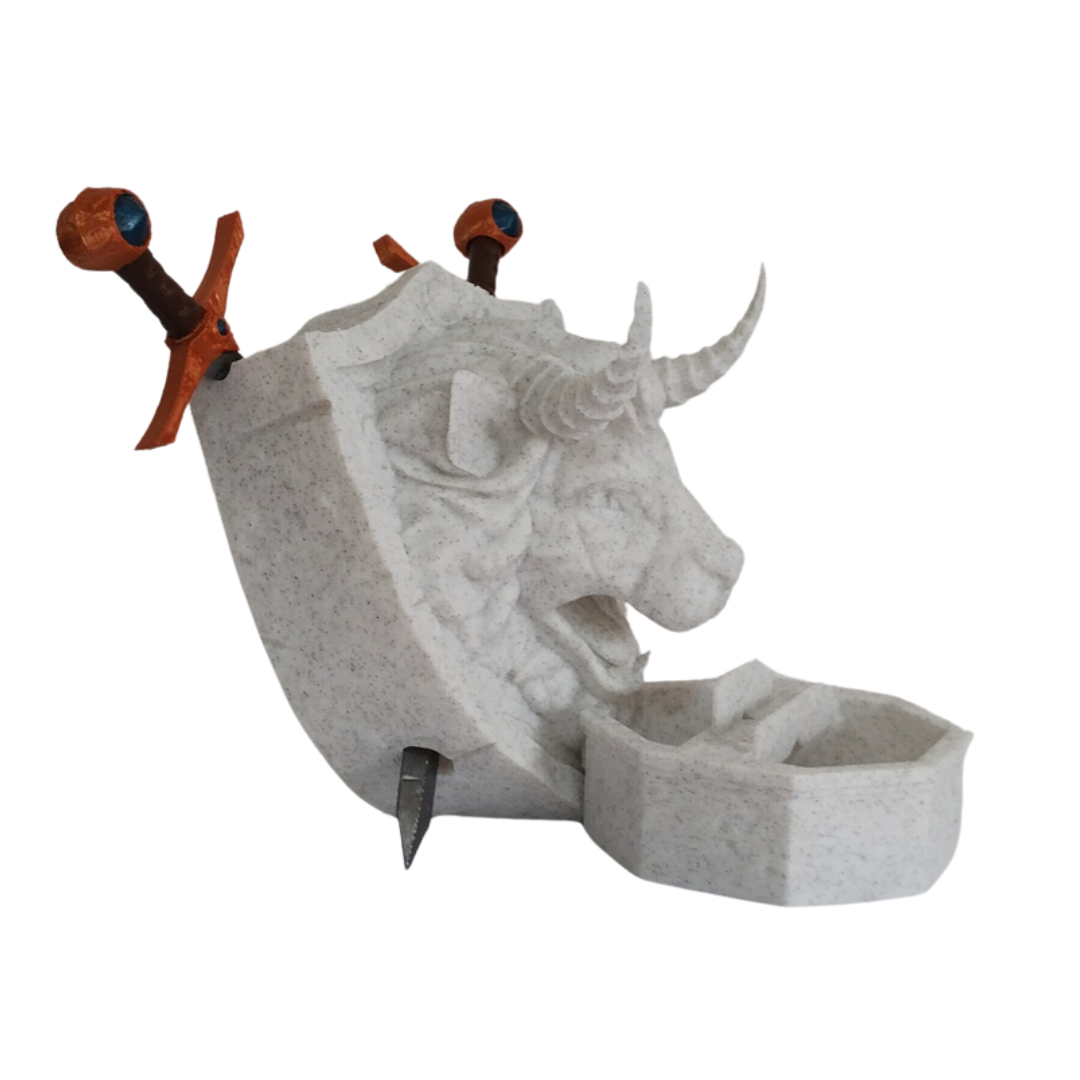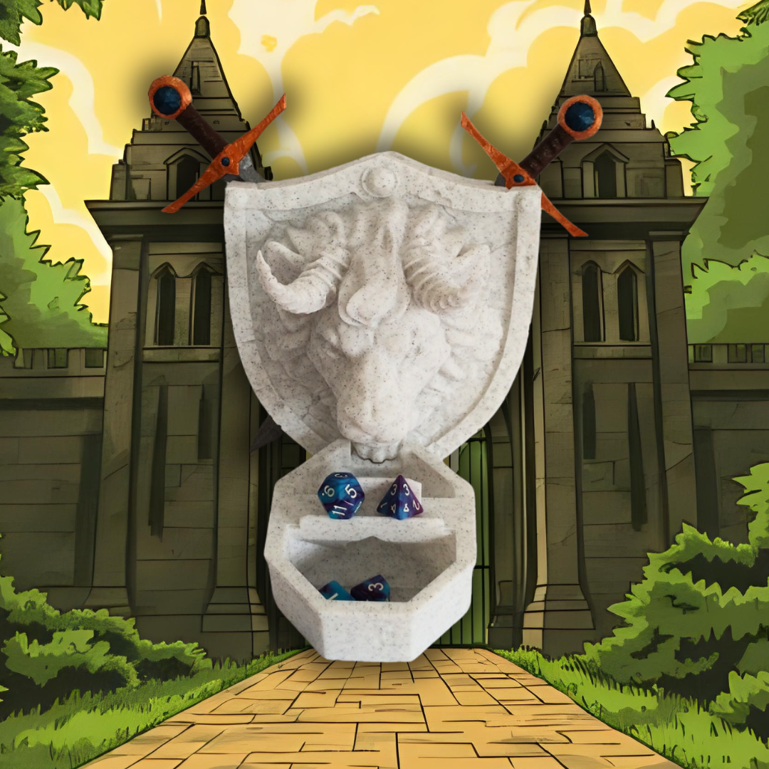 Torre de dados con forma de escudo adornado con la cabeza de un león con cuernos.